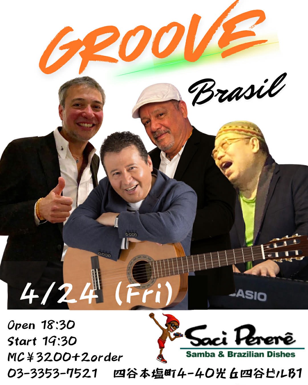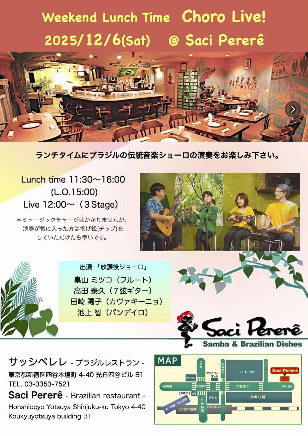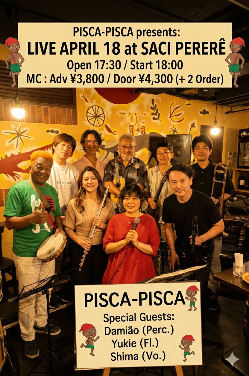 サッシペレレは1974年12月にオープンしました。おそらく日本で1番最初にブラジル料理とブラジル音楽の生演奏を楽しめるお店としてオープンし、それ以来ほぼ同じ形態で多くの皆様に「ブラジル」を紹介しております。ボサノヴァやサンバなどの生演奏(ライブ)を楽しみながら、美味しいお食事とお酒、時には踊ってお楽しみ頂くお店として皆様にご利用いただいております。