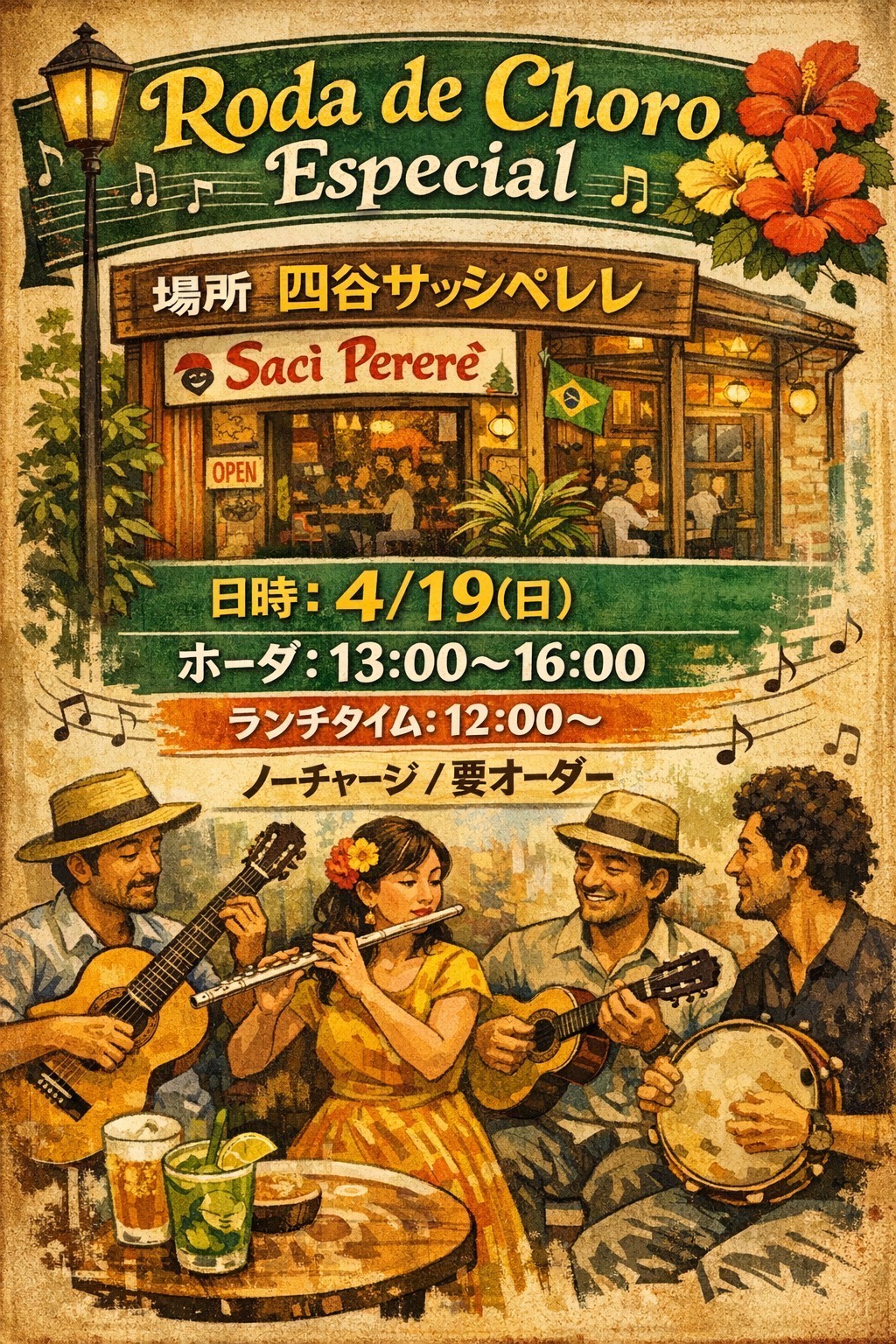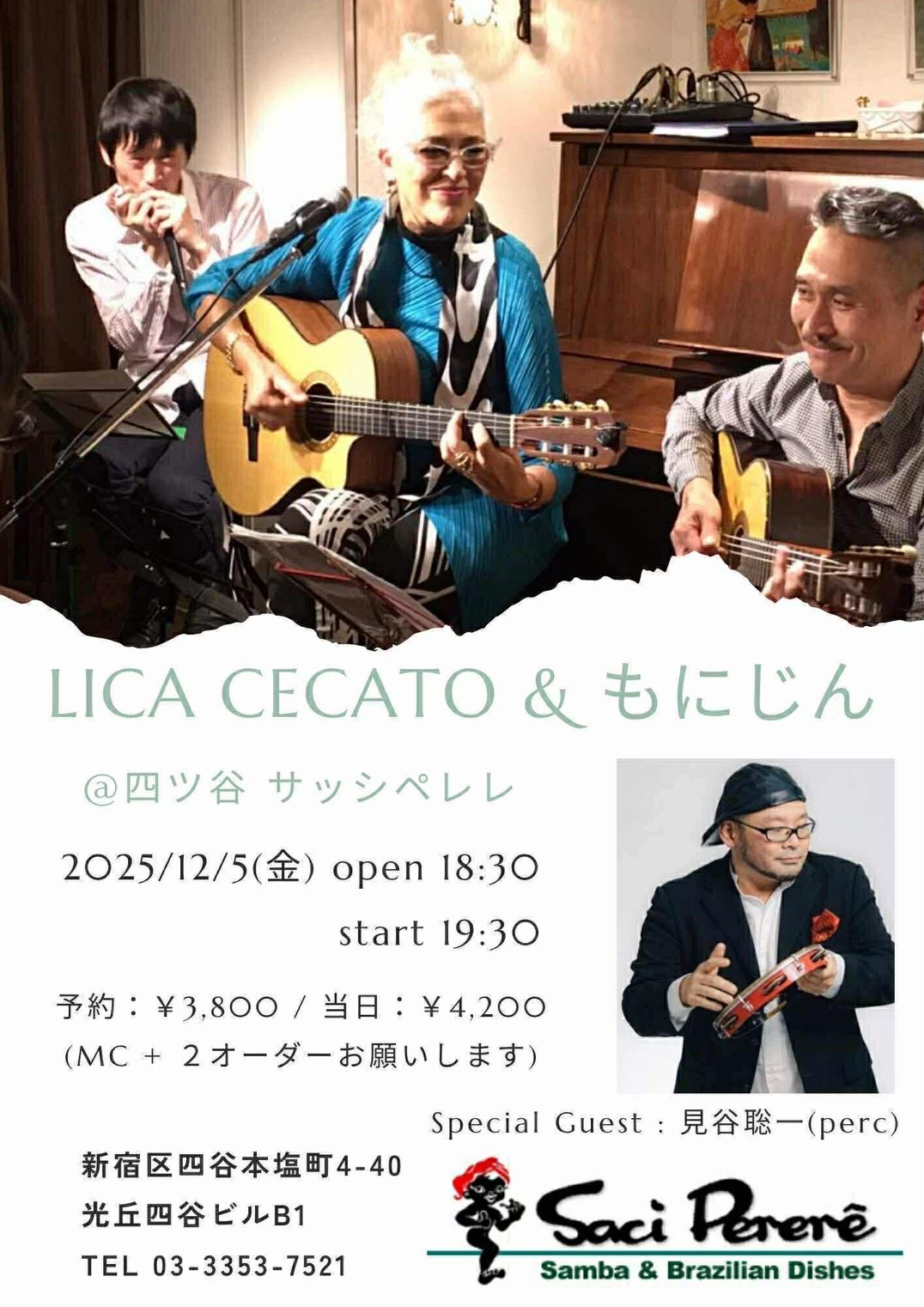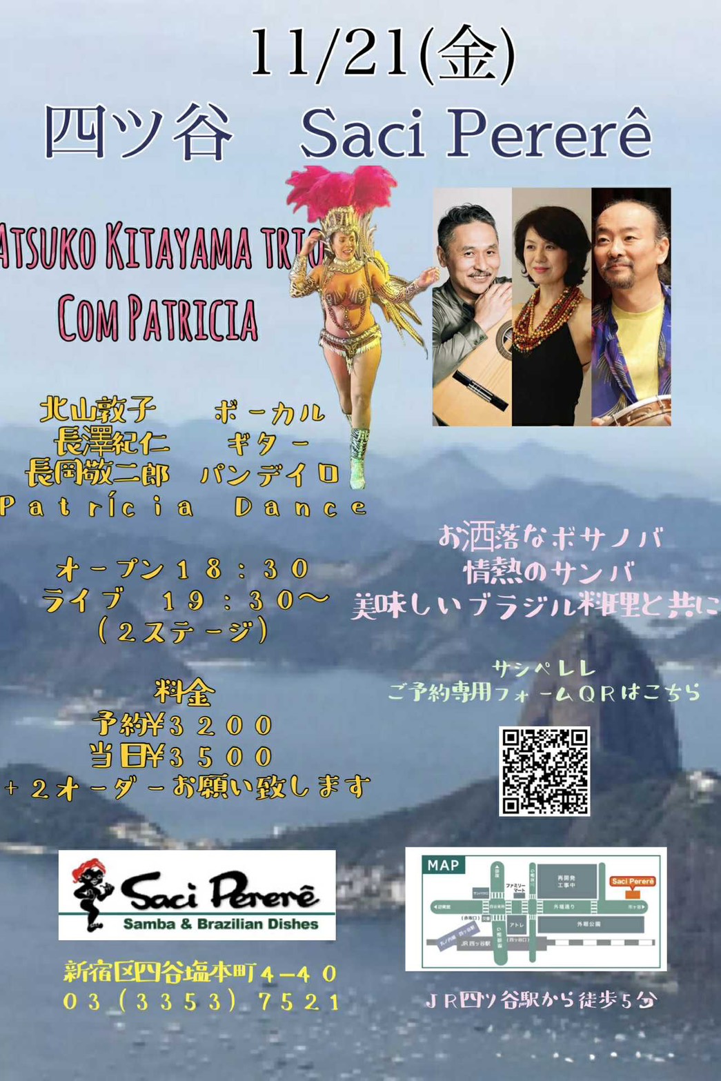 サッシペレレは1974年12月にオープンしました。おそらく日本で1番最初にブラジル料理とブラジル音楽の生演奏を楽しめるお店としてオープンし、それ以来ほぼ同じ形態で多くの皆様に「ブラジル」を紹介しております。ボサノヴァやサンバなどの生演奏(ライブ)を楽しみながら、美味しいお食事とお酒、時には踊ってお楽しみ頂くお店として皆様にご利用いただいております。