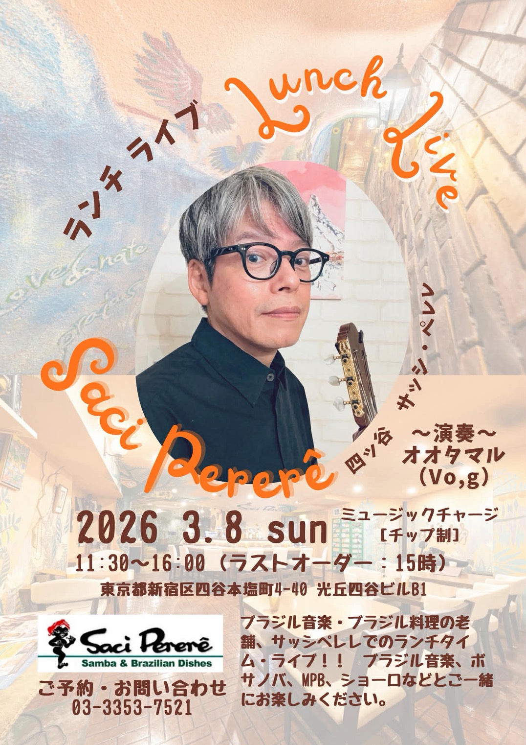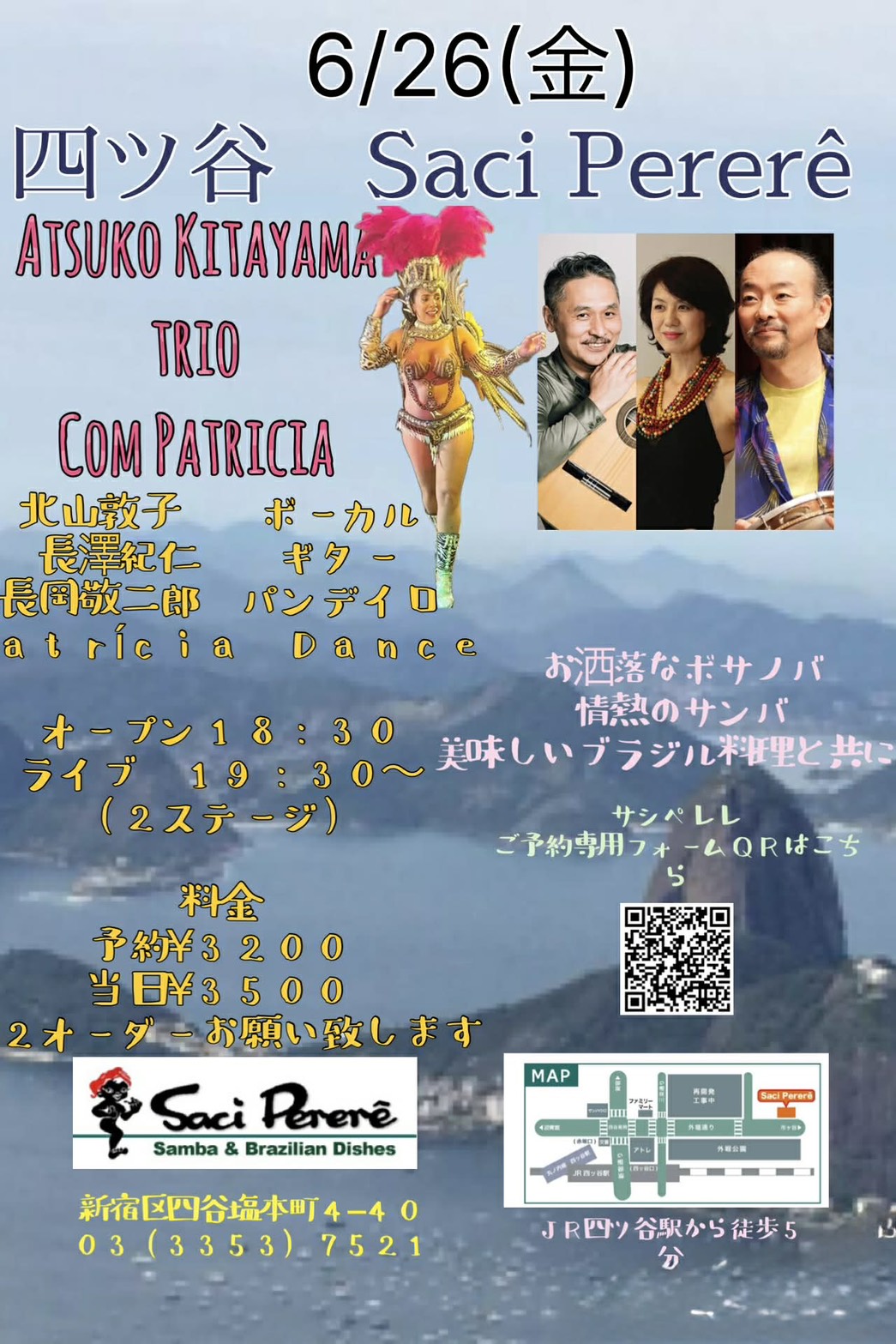 北山敦子(Vo.)、長澤紀仁(Gt.),長岡敬二郎(pandeiro)